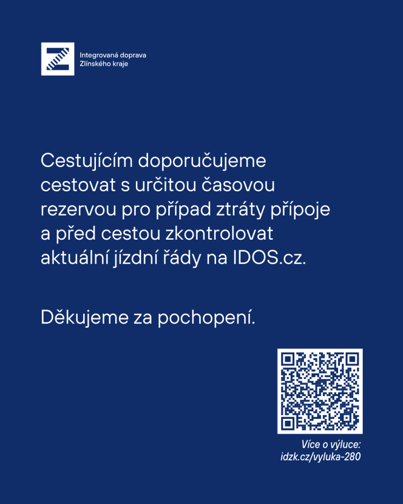 Aktualizované informace k dlouhodobé výluce na železniční trati 280 (Vsetín-Horní Lideč - Střelná). Na webové stránky https://www.idzk.cz/vyluka-280 byly nově přidány výlukové jízdní řády autobusových linek, které budou zajišťovat dopravu na trase Vsetín – Horní Lideč – Střelná (- Púchov).